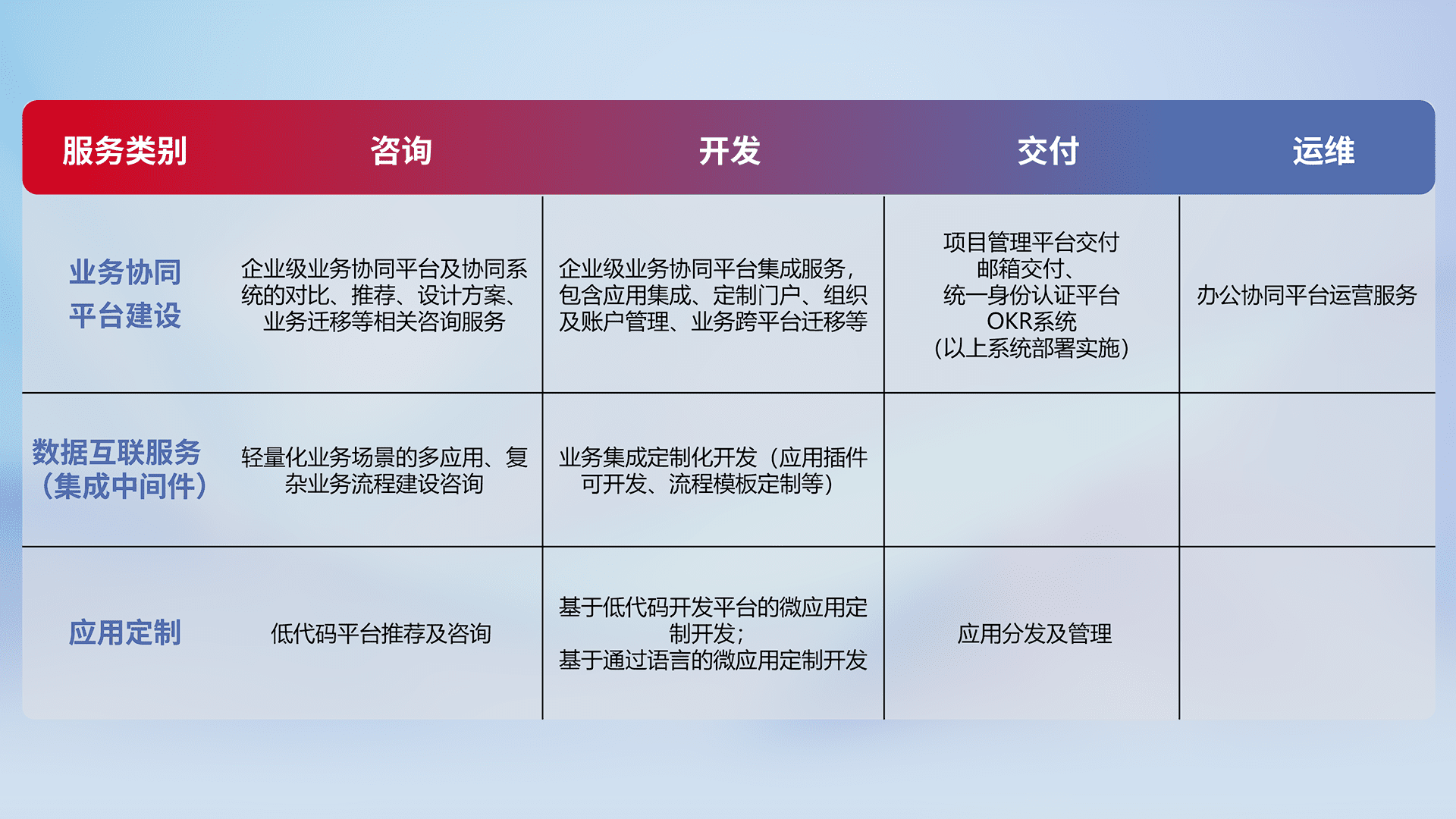针对钉钉、、、、企微、、、、IDaas等平台级产品提供产品的规划、、方案、、交付、、、定制化开发等服务,,,实现如统一协同办公、、、、智能客户服务、、混合会议管理、、智能数据查询、、、等业务场景,,实现数字化转型。。